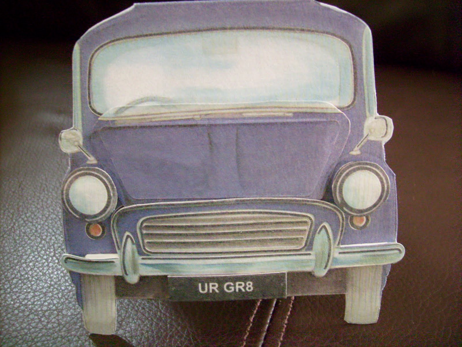 This cute little classic car card was cut out, layered up and the 'chrome' bits of the car were then highlighted with a clear glitter pen. Quick - Easy -Done!!!